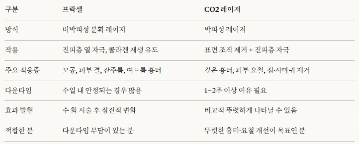 프락셀과 CO2 레이저는 각각 이 두 가지 방식을 대표하는 시술입니다.